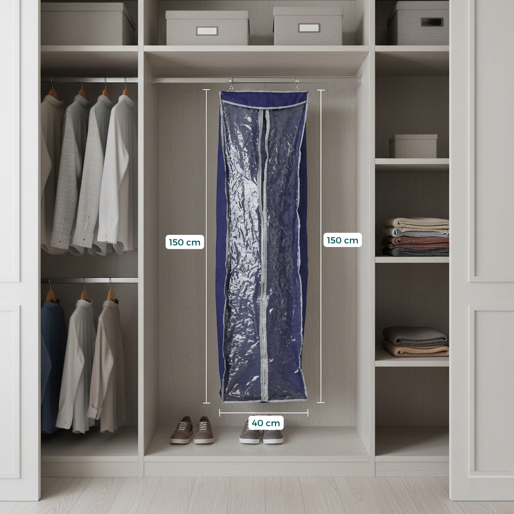 Descubrí la solución perfecta para el cuidado de tus prendas largas con este versátil ropero colgante. Su cierre de protección completa resguarda tus vestidos, abrigos y trajes de polvo y humedad. Fabricado en tela resistente de color azul, es ligero para la portabilidad y robusto para el uso diario. Se cuelga directamente en tu armario, maximizando el espacio y manteniendo tus prendas accesibles y en perfectas condiciones.