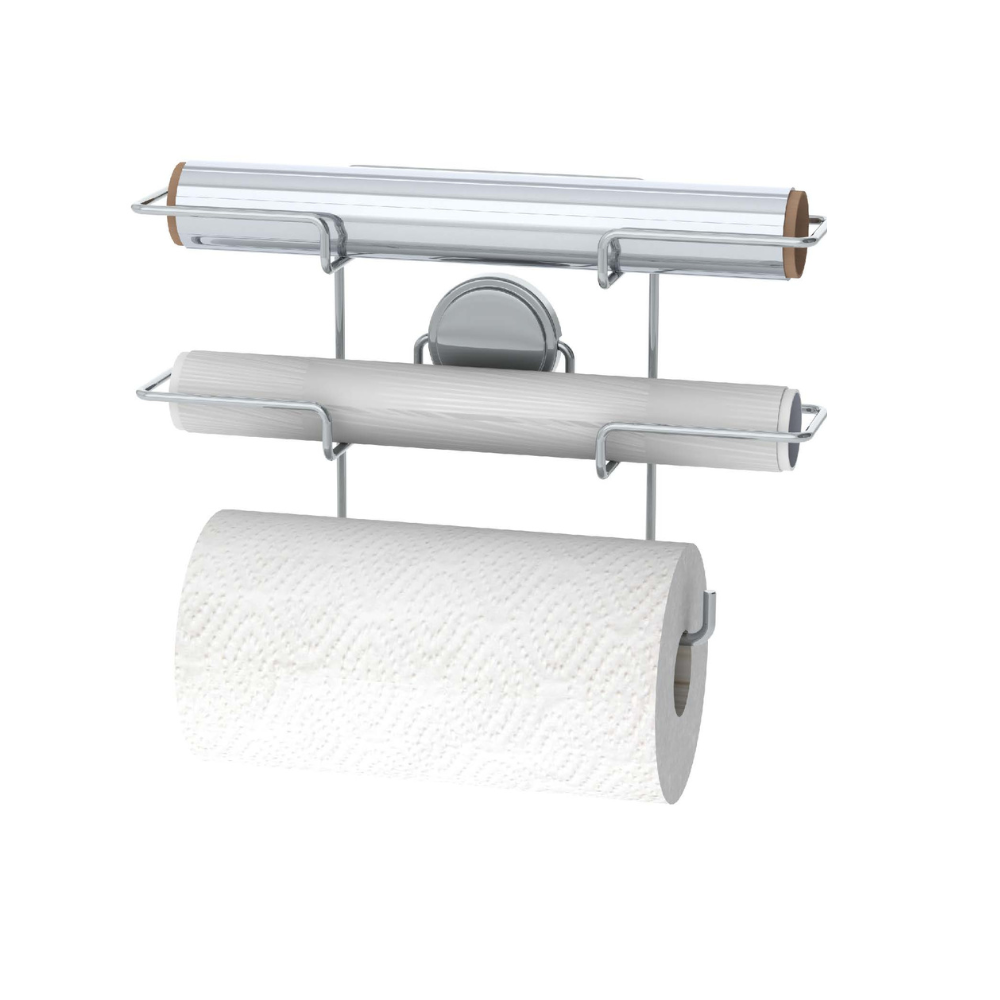 Este soporte metálico para rollos es la solución perfecta para mantener tus papeles de cocina siempre a mano y bien organizados. Su diseño de doble nivel permite colocar film o aluminio de forma accesible, optimizando el espacio en la pared o dentro de alacenas. Fabricado en acero cromado, ofrece resistencia y durabilidad.